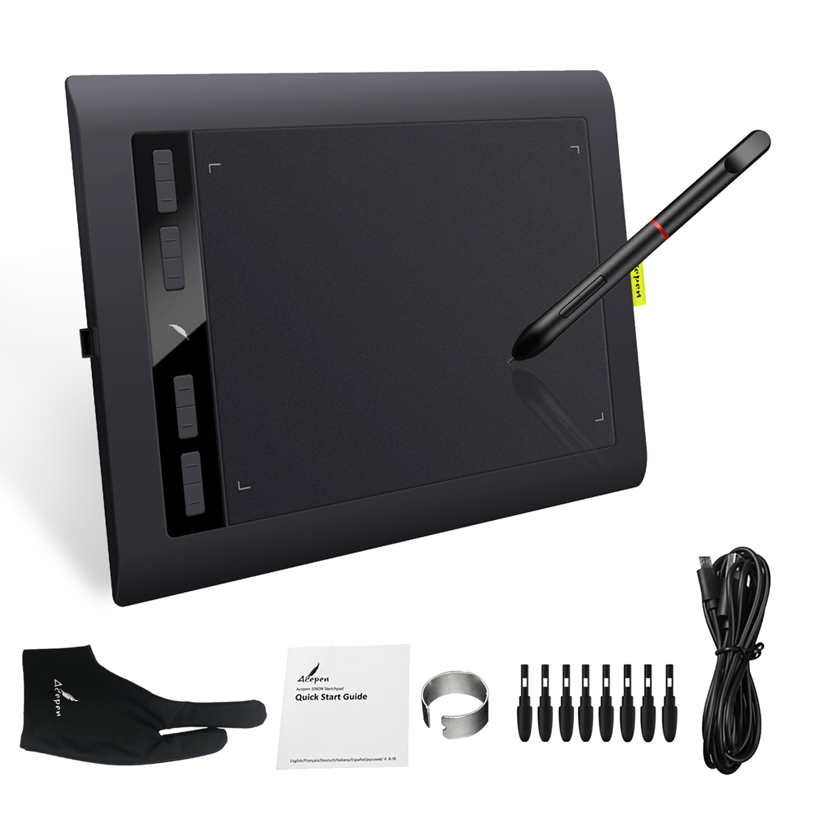 Tableta grafica Acepen AP1060, 10x6.25" compatibila Windows, MacOS si Android, 8 taste programabile, 266 PPS, 8192 niveluri presiune, Pen fara baterie, TILT ±60°, include manusa si 8 varfuri rezerva