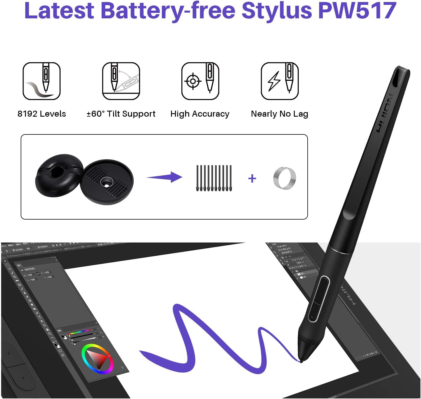 Huion PW517 este optimizat cu senzorul de presiune capacitiv Huion PenTech3.0 si cu varfuri stabile, oferindu-va cea mai naturala si extrem de sensibila experienta de desen . Impreuna cu 8192 de niveluri de presiune a stiloului, 60 de grade de functie de inclinare si 266 de puncte de raportare, PW517 reactioneaza imediat la inclinare si la fiecare miscare a mainii cu o precizie si un control uimitor.